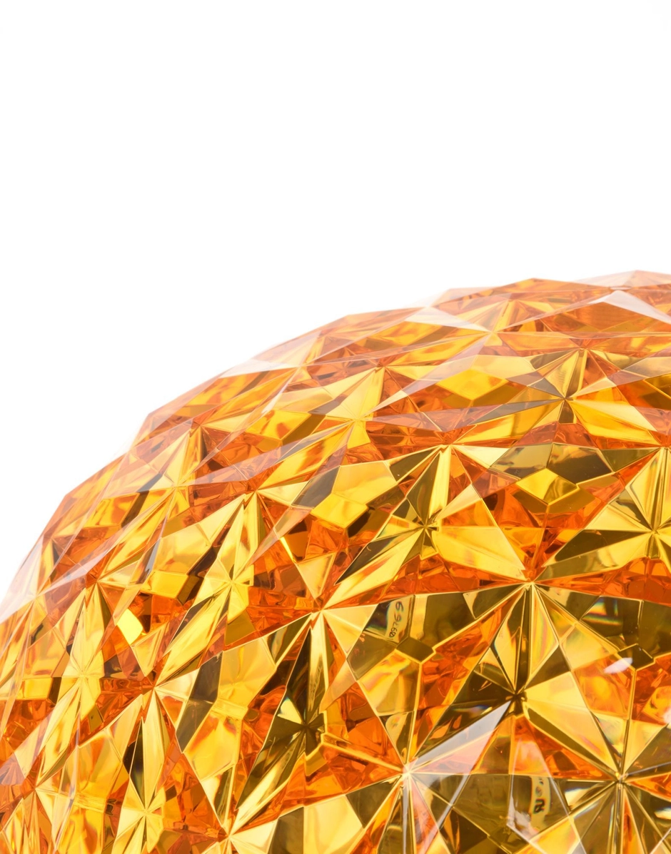 A family of lamps: suspended, for a coffee table and with a metal structure, and the most recent floor version of the lamp is available in two heights: 130 and 160 cm. The distinctive trait is the shape of the slightly elliptical transparent diffuser, which is characterised by a multi-faceted surface, both inside and out, which creates a rich tapestry of reflections.