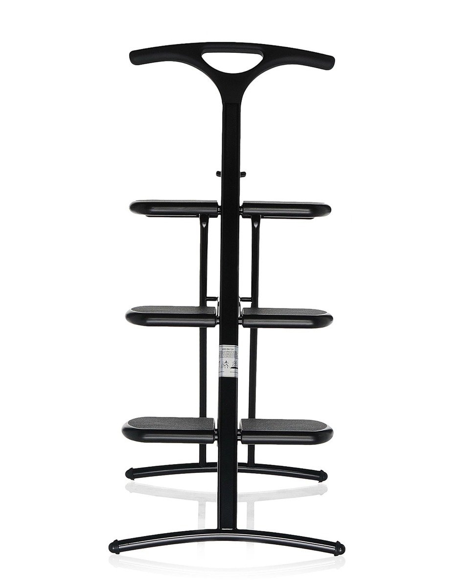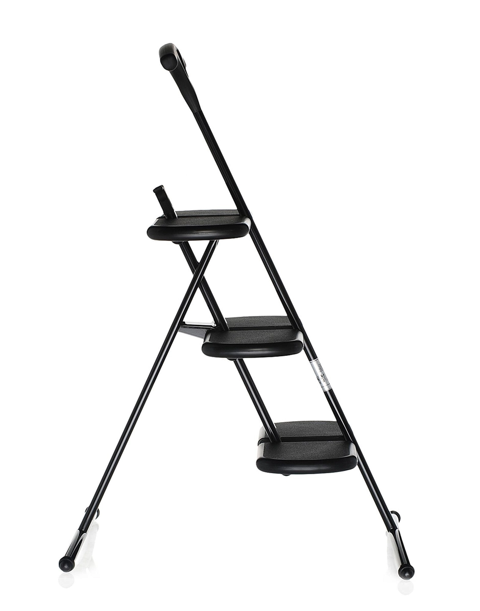 This is a functional 3-foot folding stepladder with slip-resistant finish. Tiramisù features a light supporting structural design: the curved bars offer support on the ground and the handle constitutes not only a robust support feature during use, but also a practical functional tool after use. Thanks to its design it is possible to mount Tiramisù on the wall.