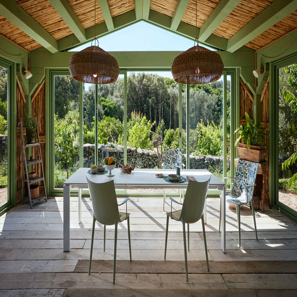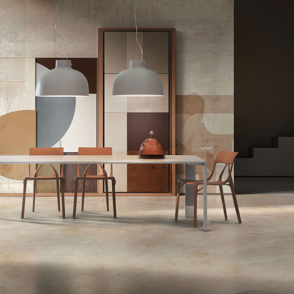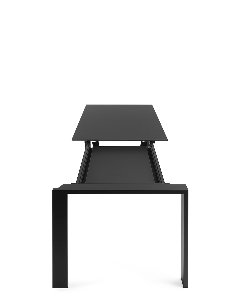 The FOUR family of tables by Ferruccio Laviani represents a perfect combination of sophistication and functionality, distinguished by its precise, geometric design. Featuring a slender top and asymmetrical legs, these tables exude elegance and originality. Now, this line introduces a new extendable variant, enhancing its adaptability to various settings. With this innovation from Kartell, FOUR tables cater even more effectively to the dynamic requirements of contemporary spaces, offering a practical and aesthetically pleasing solution for meetings, dinners, and social gatherings. The tables are available in versions with painted steel legs and a soft-touch laminate top in a 160+50+50 length configuration.