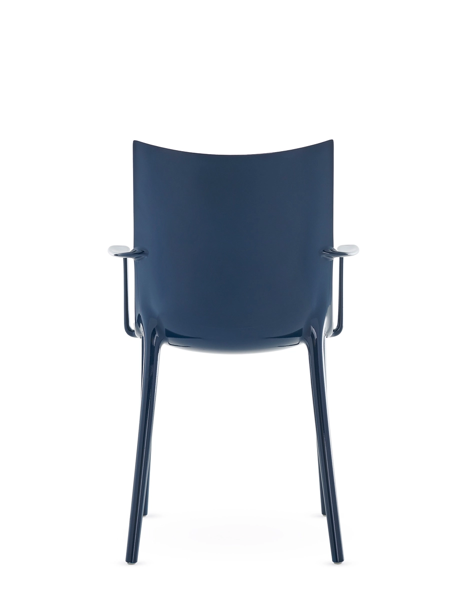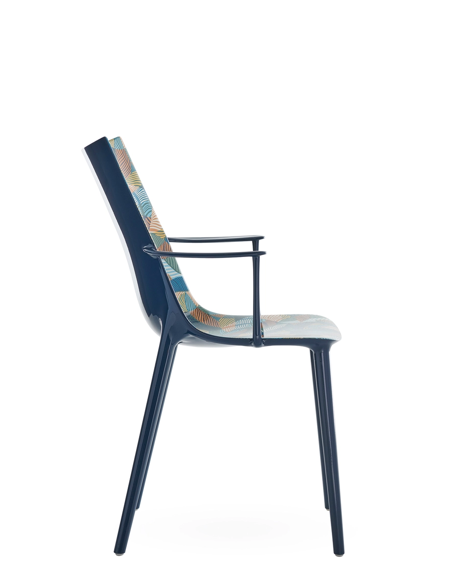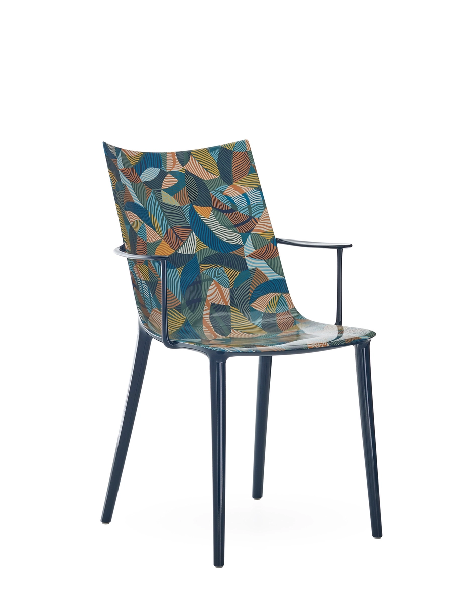 Philippe Starck elevates us to new heights with the H.H.H. - HER HIGHEST HIGHNESS chair. With unparalleled elegance and graphic impact, H.H.H. defines the very essence of the human interacting with it, compelling one to take a stance. It transcends the mere notion of sitting, transforming every moment spent upon it into one of true majesty. The frame is crafted from recycled material, and the seat is available in various finishes: recycled leather with green tanning treatment, in black and tan colours, eco-friendly texture sourced partly from recycled material and partly from renewable sources in black and tobacco colours, and in super glossy finish in white, black, burgundy, rust, mustard, blue and green. But H.H. rises above the simple practical functions of a chair, becoming an emblem of style that enchants and inspires anyone who approaches it thanks to the Kartell x Liberty edition, upholstered in six Liberty fabrics featuring lively floral prints. Faithful to its pioneering role in the search for new and different forms of technological innovation, Kartell has also decided to take a further step in this direction, experimenting with a new high-tech industrial printing process called “graphic impression”. This technique will be used to produce 4 floral and geometric patterns in different colour versions.