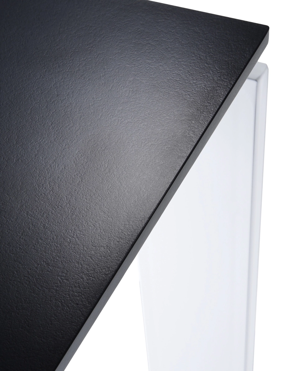 This functional and refined table also has a strict geometric design. Thanks to the elegant design solution, the position of the slim table top allows for the convenient positioning of drawers or storage furnishings for computer hardware. They can be placed side-by-side to form office workstations.