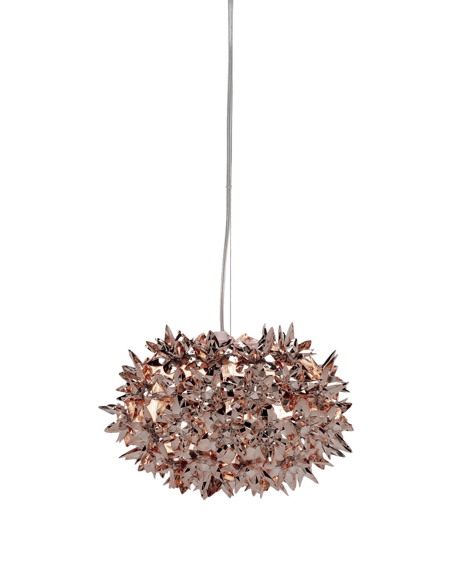 Bloom de Kartell se compose d'un squelette tubulaire entièrement recouvert d'une structure formée de petites fleurs à double corolle en polycarbonate transparent. Le résultat est une lampe produite industriellement mais avec les formes et la complexité stylistique d'une pièce unique, artisanale. Des ampoules placées à l'intérieur de la structure diffusent, à travers les pétales, le faisceau lumineux qui se réfléchit sur les surfaces facettées des fleurs en donnant naissant à mille reflets.