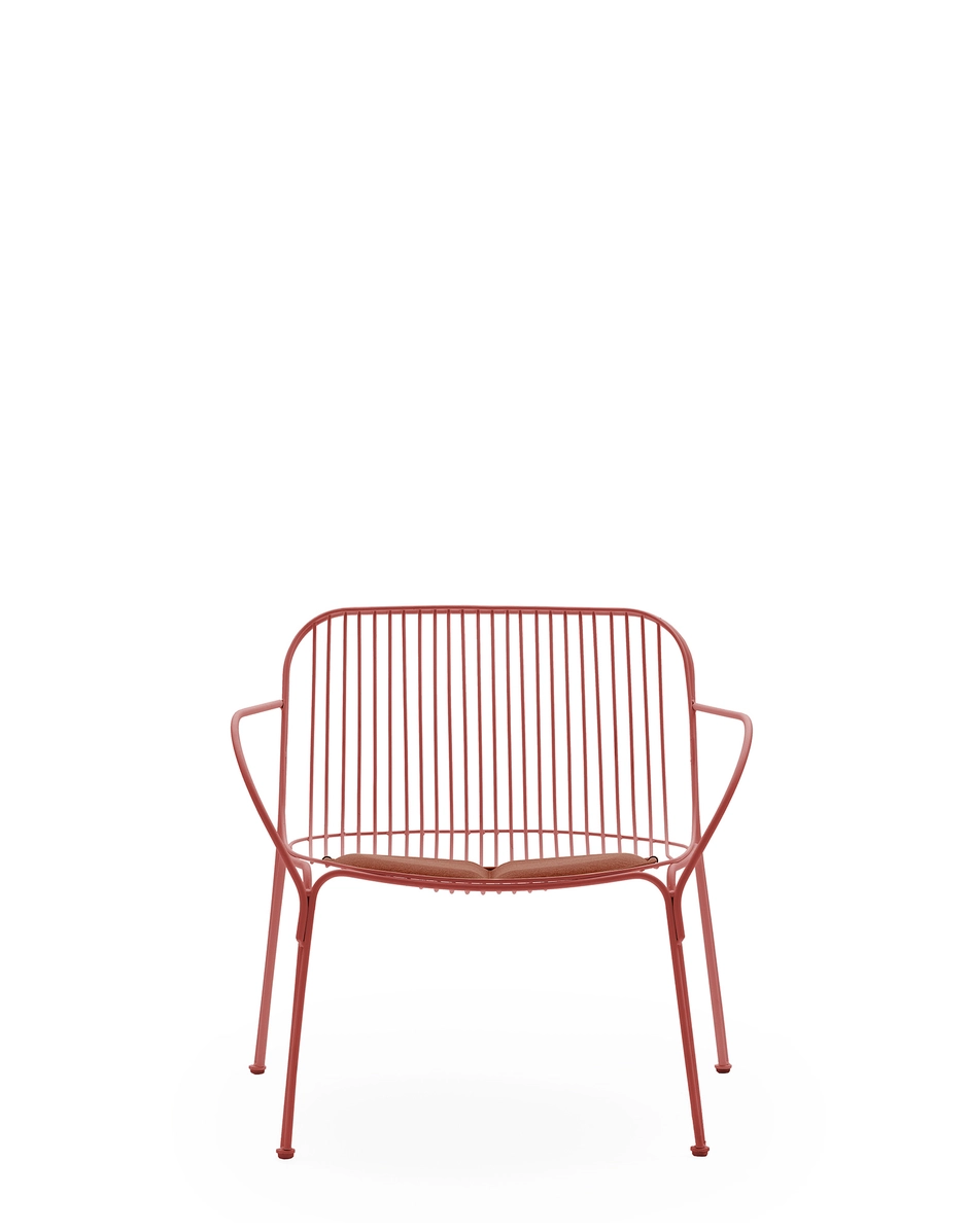 HIRAY spielt mit Metall, das zu den wichtigsten Materialien in der grün-ökologischen Neudefinition des Kartell-Katalogs zählt und nach der Technik des gelöteten Drahtes verarbeitet wird. Das Ergebnis ist ein essenzielles und funktionalistisches Gebilde, das in der Lage ist, zahlreiche Emotionen zu wecken. Die Metalldrähte bilden Formen mit klar definierter, aber leichter Struktur: Stuhl, Armstuhl, Bistro-Tisch, Sessel, Sofa und Beistelltisch. Die Farben der Kollektion sind Weiß, Bordeaux-Rot, Schwarz und Grün.