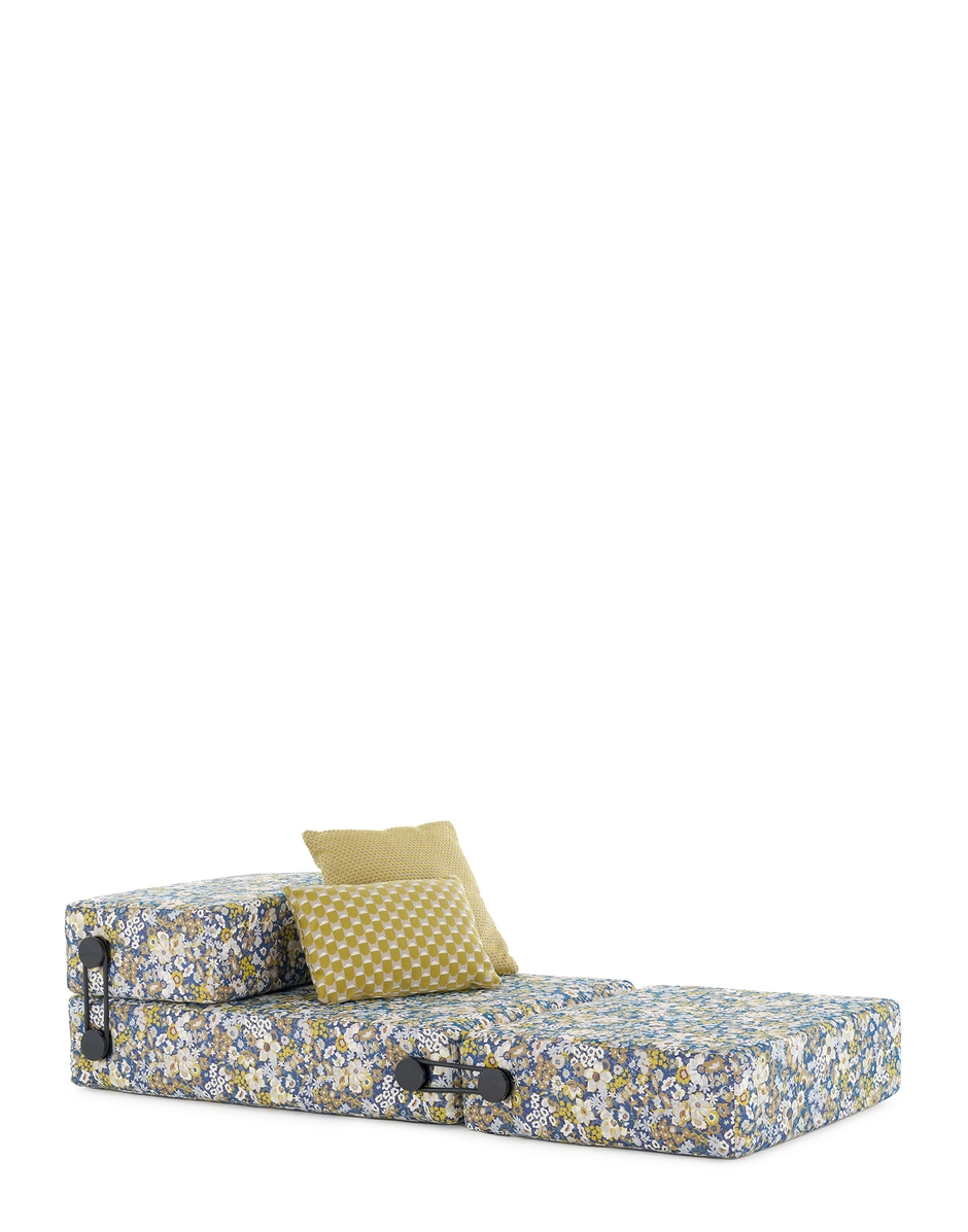Dank der Verwendung von speziell für den Außenbereich entwickelten Liberty-Stoffen, präsentieren sich das Sofa Plastics, der Hocker Trix von Piero Lissoni und der Sessel Cara von Philippe Starck in einem völlig neuen Look. Diese Stoffe verleihen den Produkten eine neue ästhetische und funktionale Dimension und garantieren Widerstandsfähigkeit und Langlebigkeit auch im Außenbereich. Mit zwei geometrischen Mustern und einem Blumenmuster bietet diese Outdoor-Möbelkollektion eine einzigartige Mischung aus Stil und Komfort, sodass Sie den Sommer auf elegante und entspannte Weise erleben können. Jedes Stück, vom Sofa über das Klappsofa bis zum Sessel, wird so zu einer wertvollen Ergänzung, um Außenbereiche geschmackvoll und raffiniert einzurichten und gleichzeitig ein angenehmes Entspannungserlebnis im Freien zu bieten. Erhältlich in den Farbpaletten Salbei, Rost, Beige, Gelb und Blau.