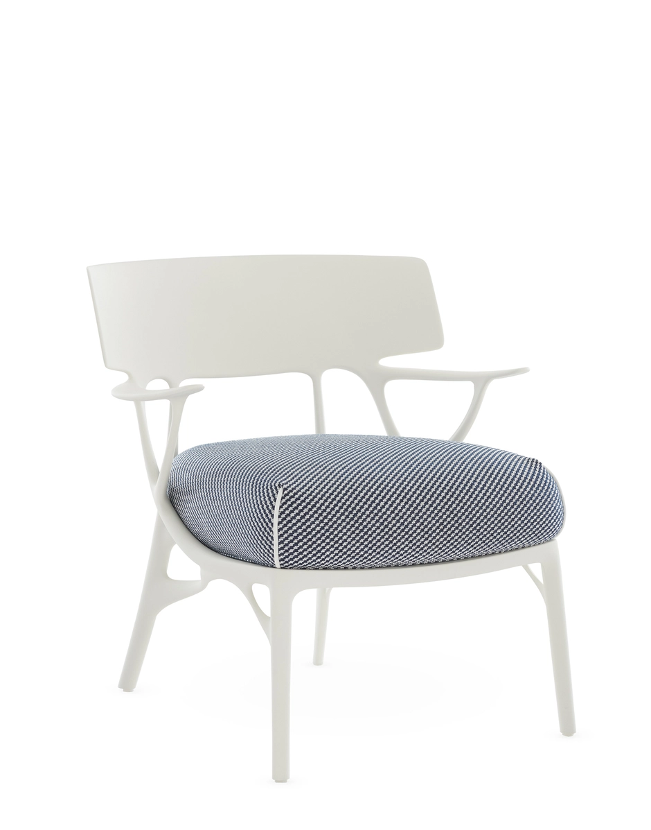 A.I. LOUNGE is the new armchair from the A.I. family that combines sustainable materials and comfort with a graphic design that looks to the future and well-being in our living spaces. An armchair for the living room in which the contours, a distinctive feature of the collection, are combined with maximum seating comfort.Available in white, black, orange and grey and in versions with and without a cushion for indoor and outdoor use.