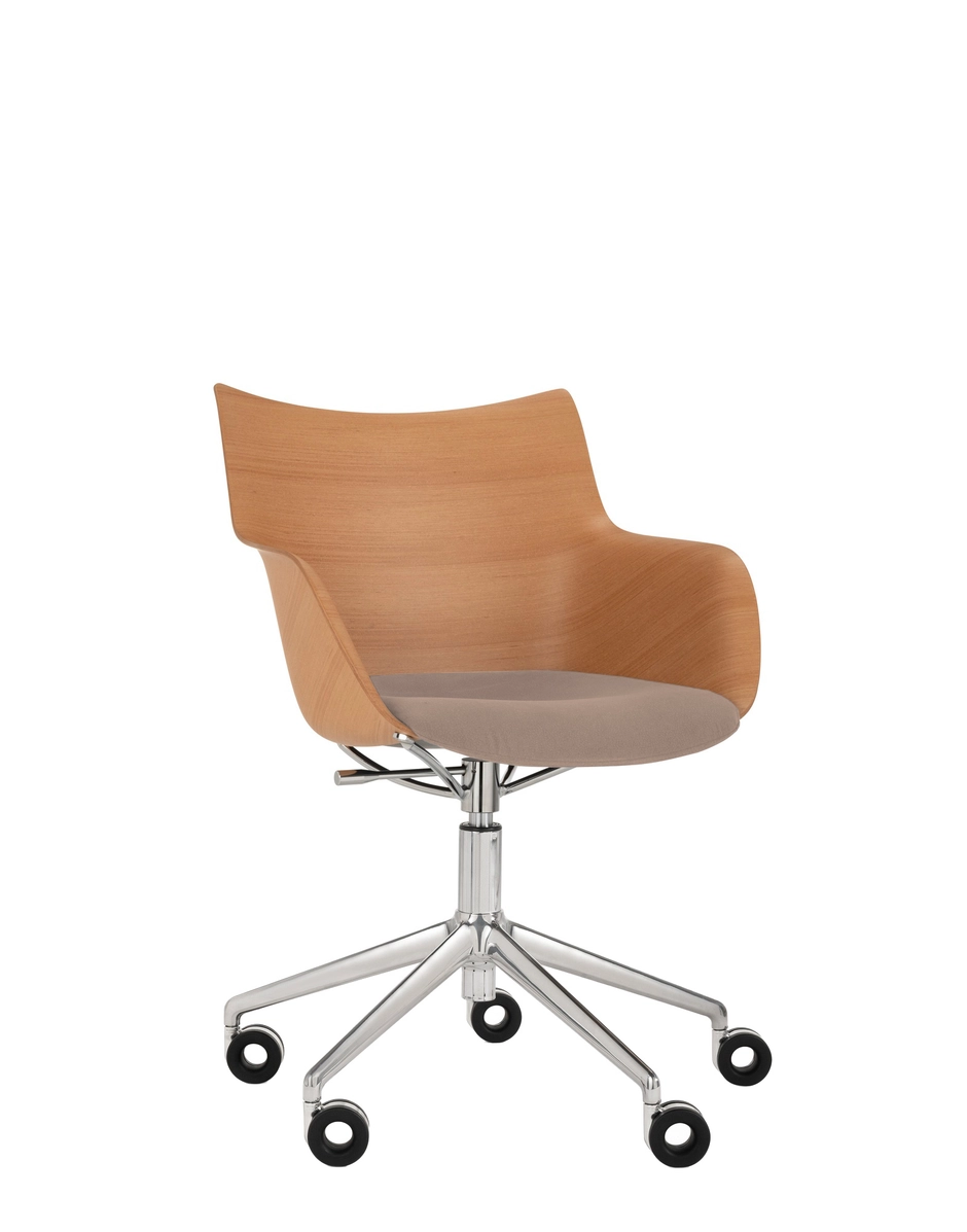 These brand-new rotating armchairs on wheels are the latest addition to the armchair collection. Q/wood is characterized by a woodworking, combining timeless elegance with contemporary forms, and is available in three colour variants: light wood with a white seat and chrome structure, dark wood with a black seat and chrome structure or dark wood with a black seat and black structure