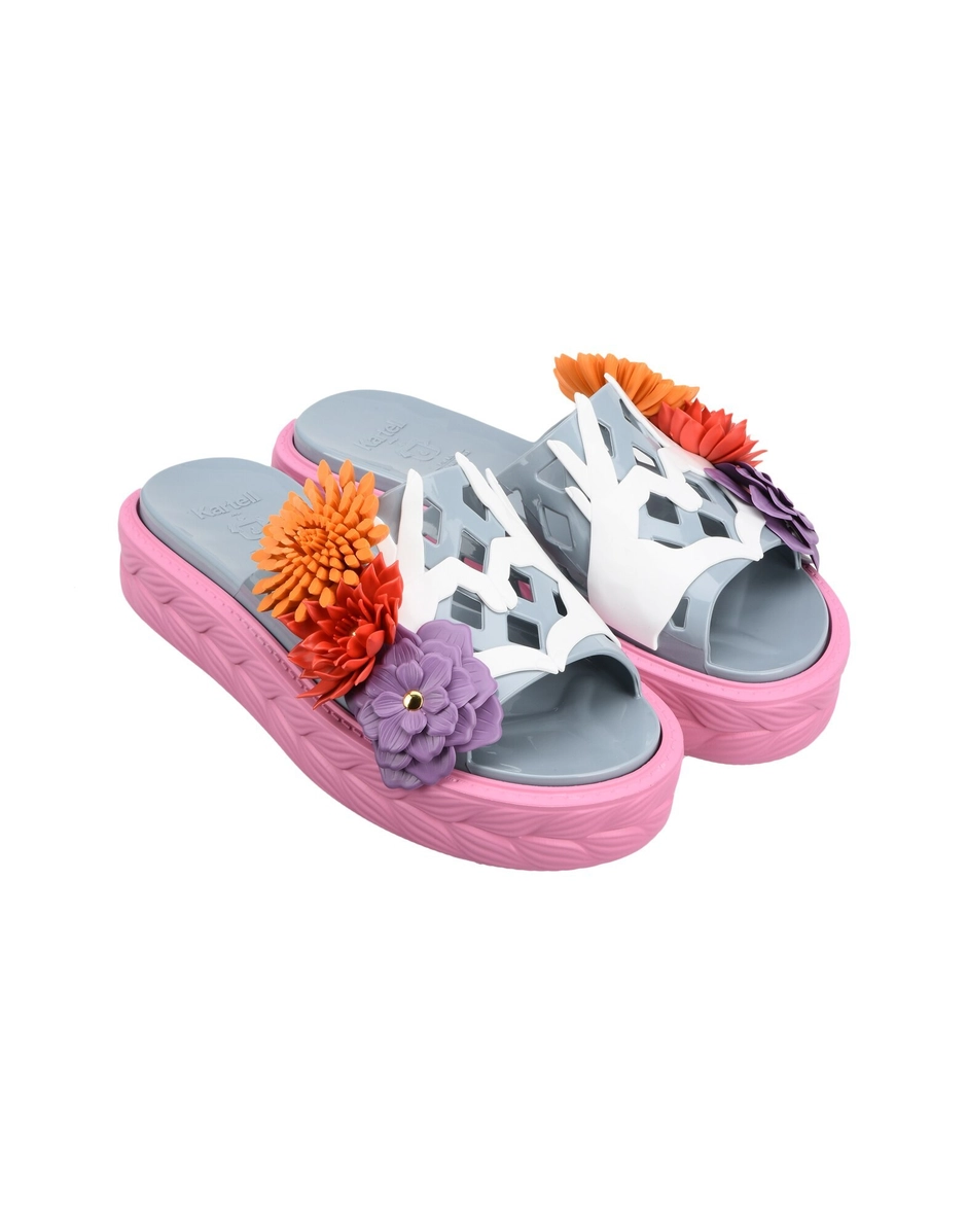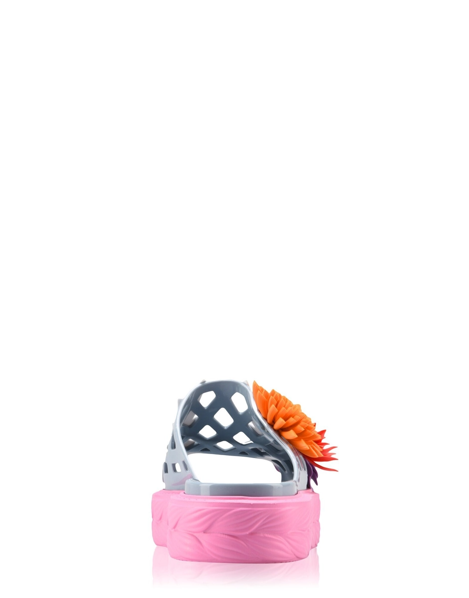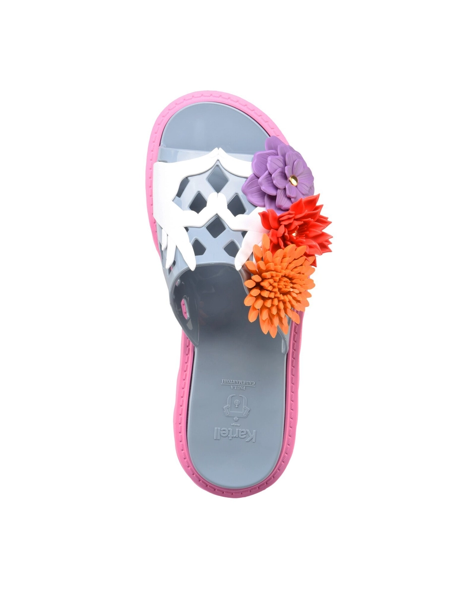 The Claudia sandal comes in different colour variants. The motif consisting of two hands joined in a heart shape characterizes the upper band, to which three-dimensional artificial flowers have been affixed.