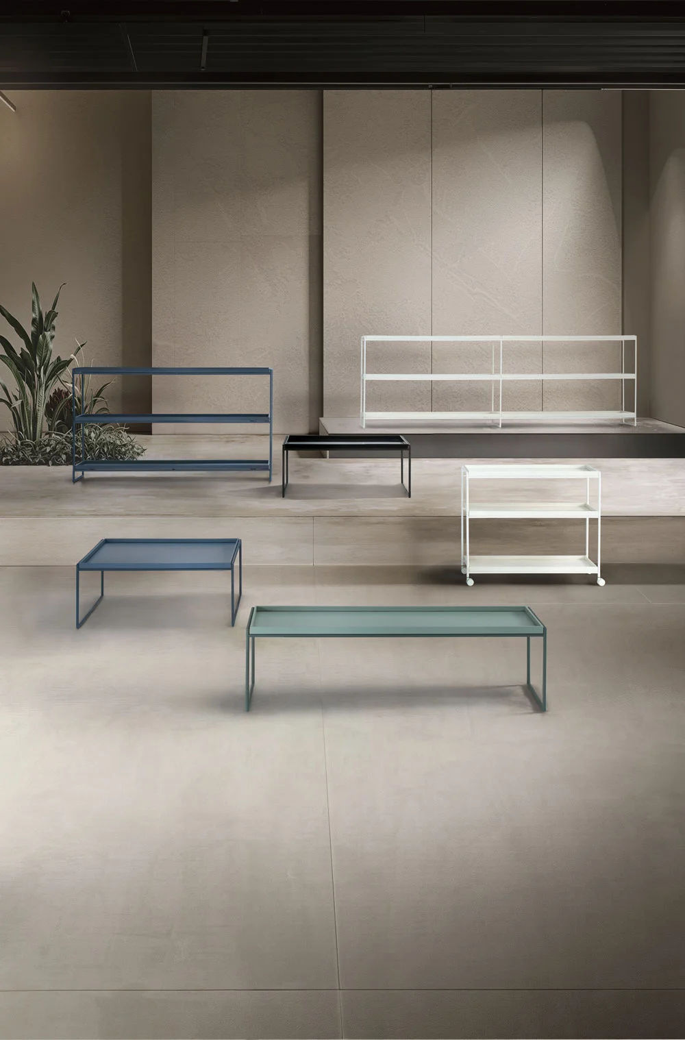 TRAYS is a versatile shelving system for home or office use. The concept is that of a set of tables, trolleys and shelves with surfaces inspired by traditional Japanese lacquered trays in both design and finish. The TRAYS collection is now bigger than ever, with new heights and shapes covering a wider range of modern needs and functionalities. TRAYS also boasts a new colour palette, with metal frames now in tone on tone shades.
