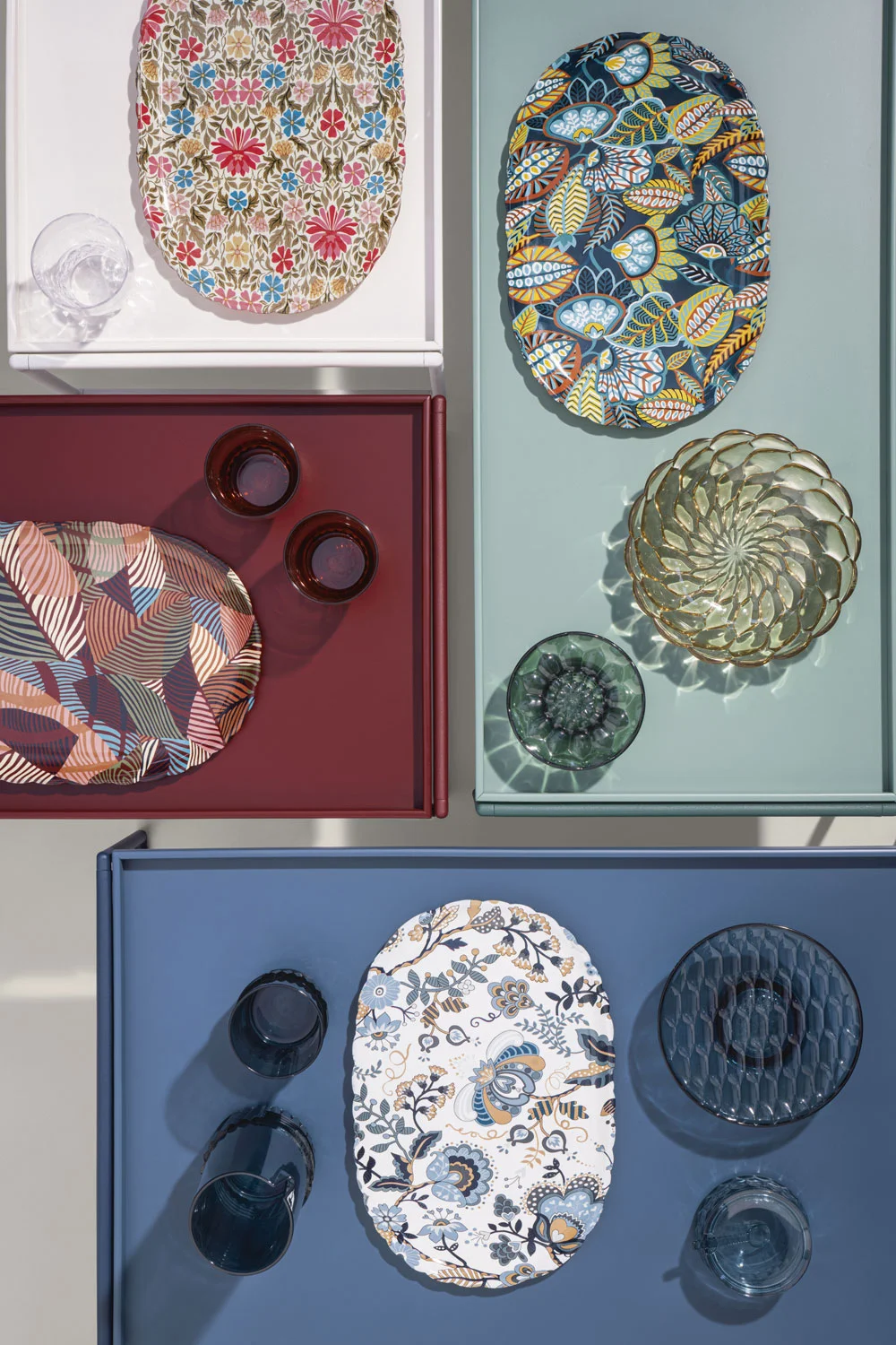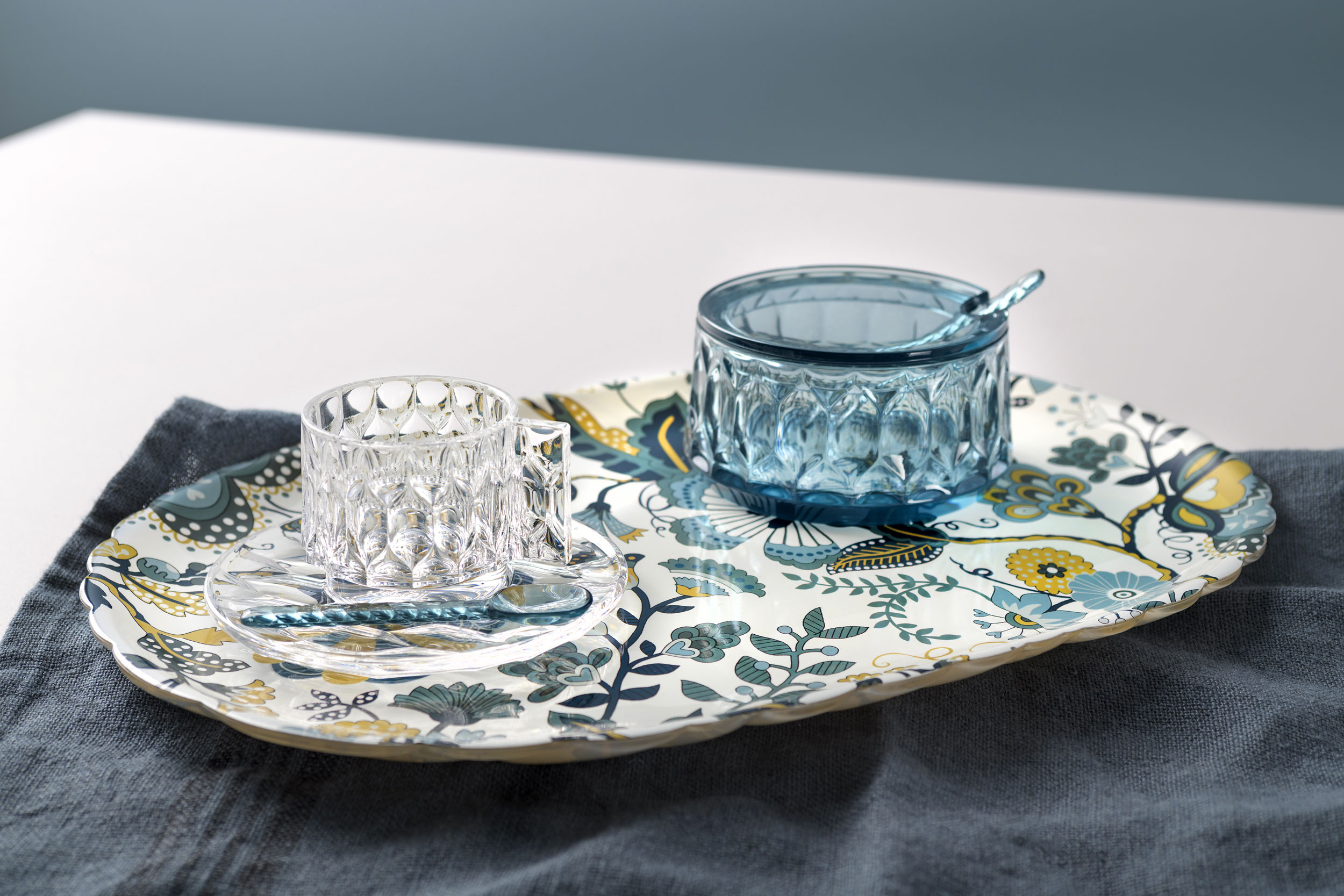 A comprehensive line of plates, trays, glasses, bowls, carafes, coffee cups and sugar bowls. The line's individuality is down to the fact that each model presents a different pattern inspired by the moulds that were once used for making jellies. The overlapping sections and colourful juxtapositions create an imaginative yet discreet ensemble that is both creative and sophisticated.