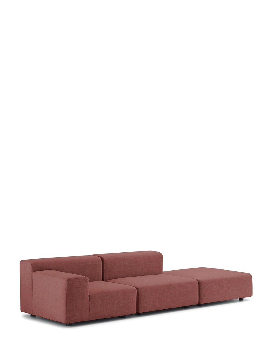 Plastic Outdoor is the outdoor version of the modular sofa with severe lines characterised by large cushions made of soft polyurethane upholstered in fabric. The Plastics collection is completed by an armchair with the same features and by a pouf, which can be used individually or as part of an arrangement.