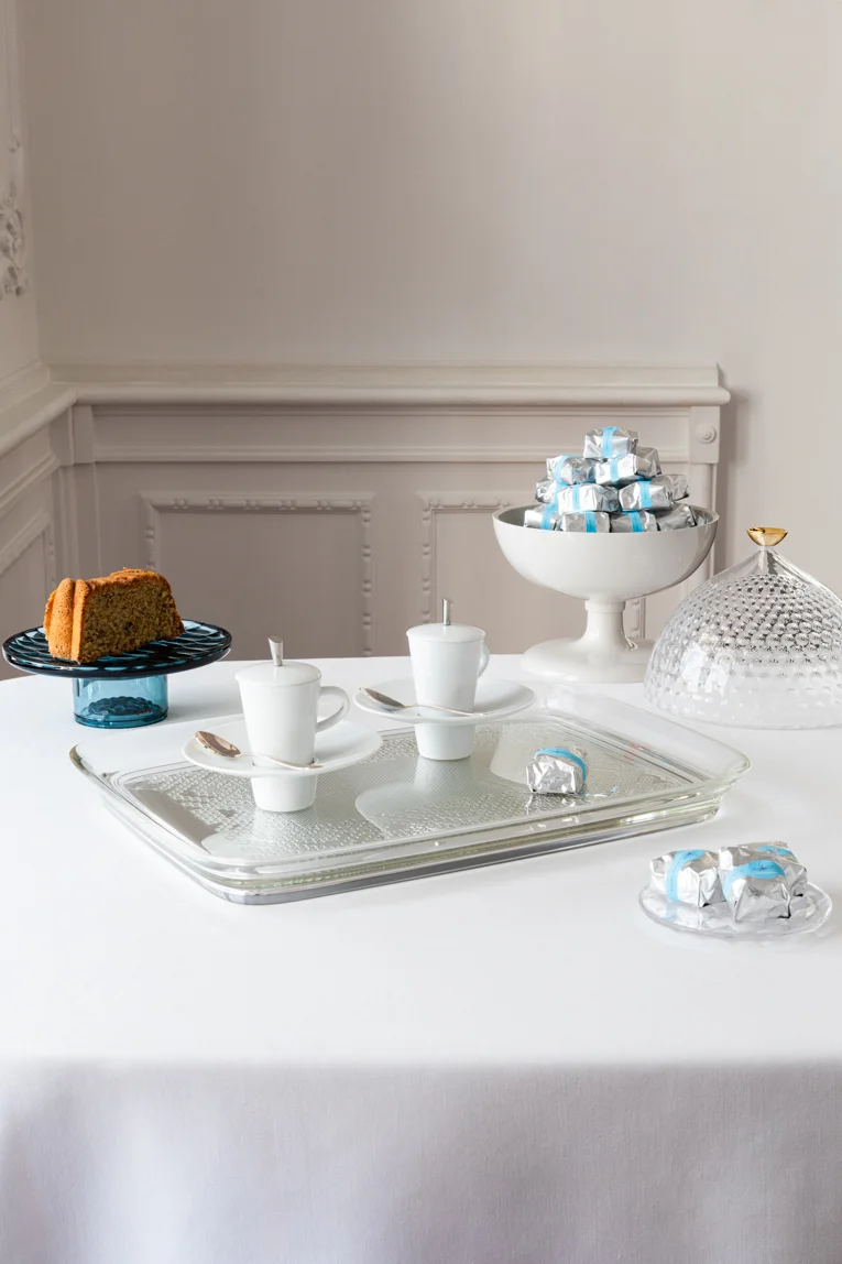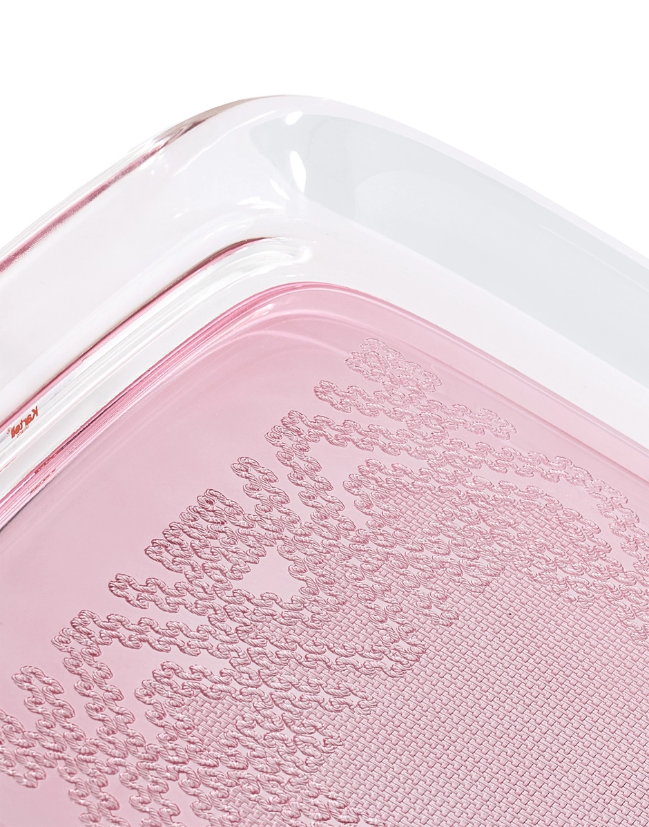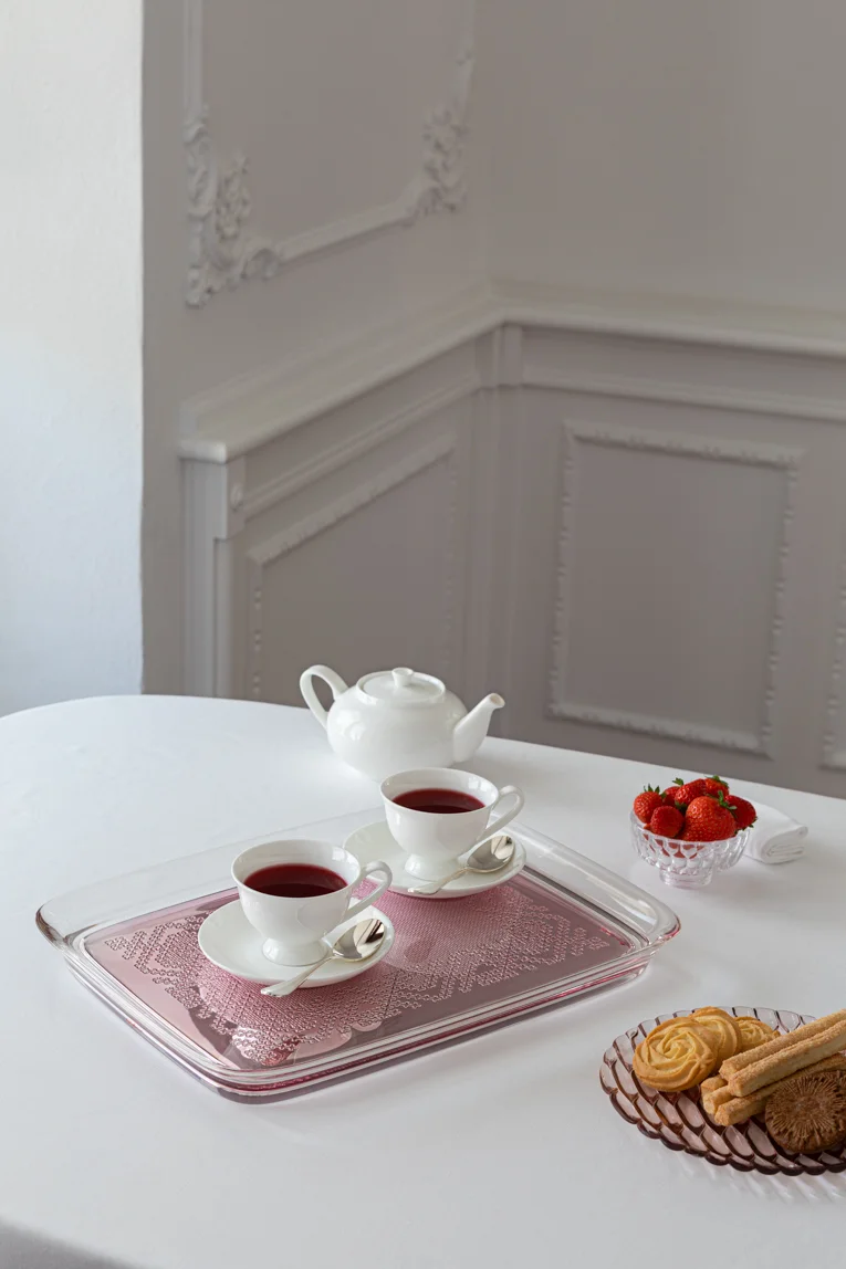 Precious embroidery, reminiscent of the past but becoming a discreet and familiar design object, like family tea time. TEATIME is Philippe Starck's new tray, which plays with references to crocheted openwork applied to the new high-tech sustainable material. Available in gold, bronze, chrome and pink.