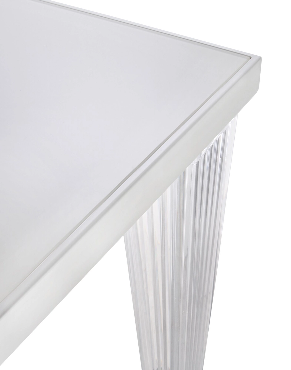 The TopTop table line is distinguished by its leg which can be either a round or square transparent section with a multi-faceted surface and metal core.