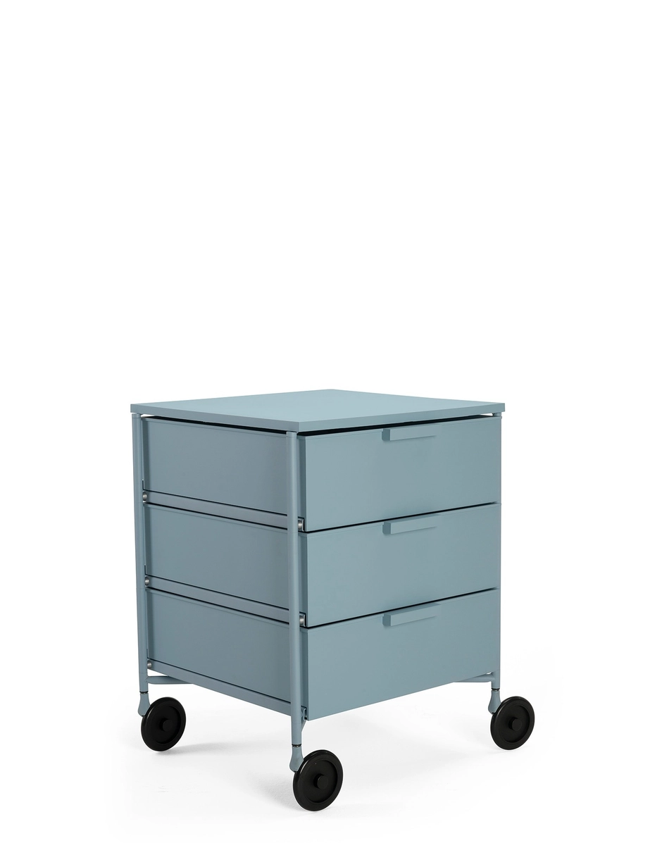 Winner of the Golden Compass in 1994, the Mobil chest of drawers is presented in a matt version in white, black, green, plum and light blue. The new edition is made of recycled industrial materials, and has the same robust construction and functionality as the original. The basic element of the system is the drawer, alternated with shelves and tops, connected by an aluminium structure.
