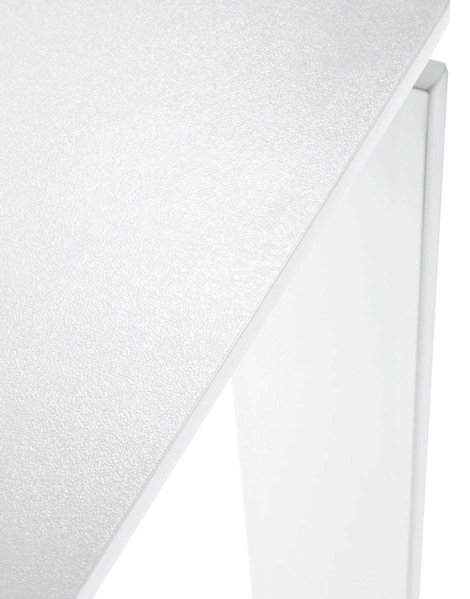 This functional and refined table also has a strict geometric design. Thanks to the elegant design solution, the position of the slim table top allows for the convenient positioning of drawers or storage furnishings for computer hardware. They can be placed side-by-side to form office workstations.
