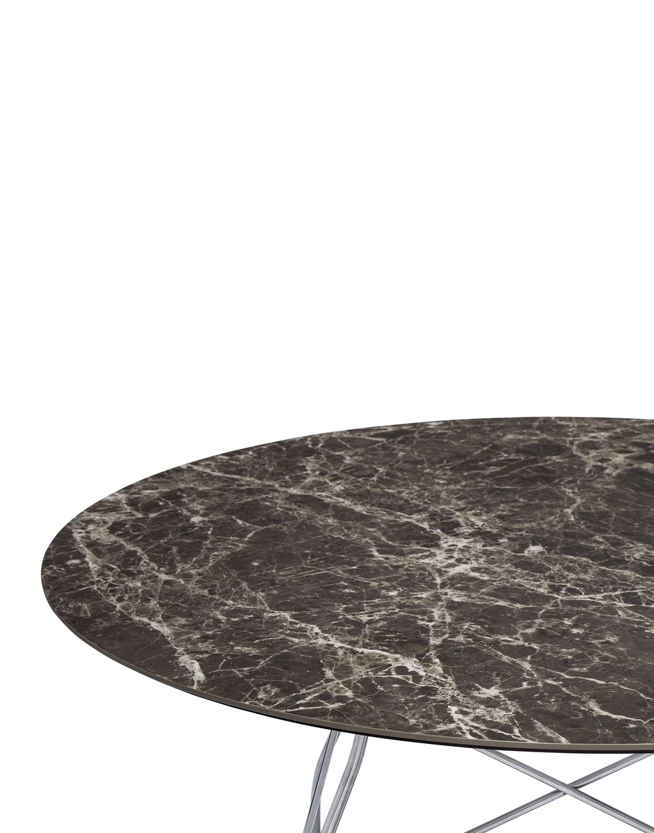 A family of tables ideal for the home and office. The light steel structure is made particular by the use of the cross element that joins the legs on each of the four sides, supporting the top. The collection comprises square, oval and round versions.