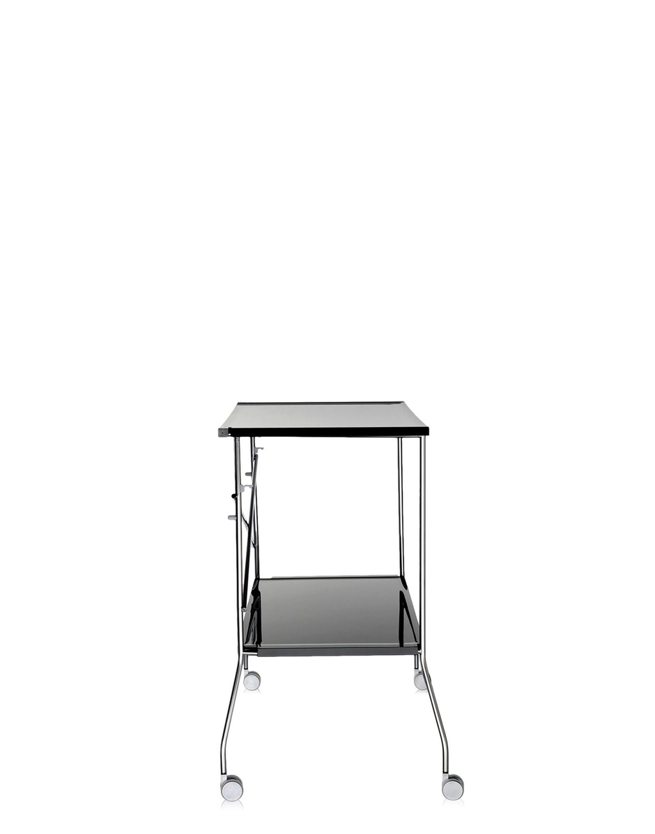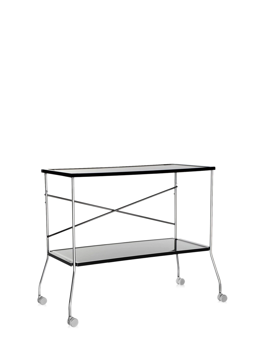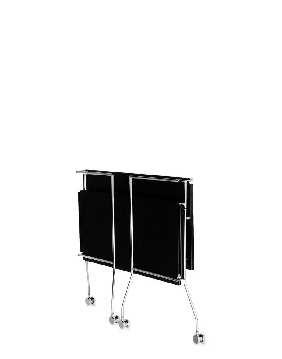 Flip se puede usar como carro, ideal para aperitivos y buffet, pero también como una práctica mesita frente al sofá; se pliega y, una vez cerrado, ocupa un espacio mínimo y se puede guardar con mucha facilidad.