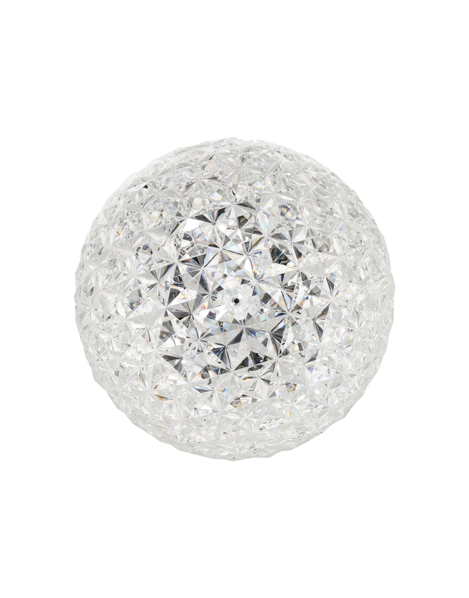 Une famille complète de lampes : à suspension, de table basse et avec structure en métal, et la dernière version, sur pied, disponible en deux hauteurs, de 130 et 160 cm. Leur particularité réside dans la forme légèrement ovoïdale du diffuseur transparent, caractérisé par une surface à facettes à l’intérieur comme à l’extérieur, qui crée un jeu intense de reflets.