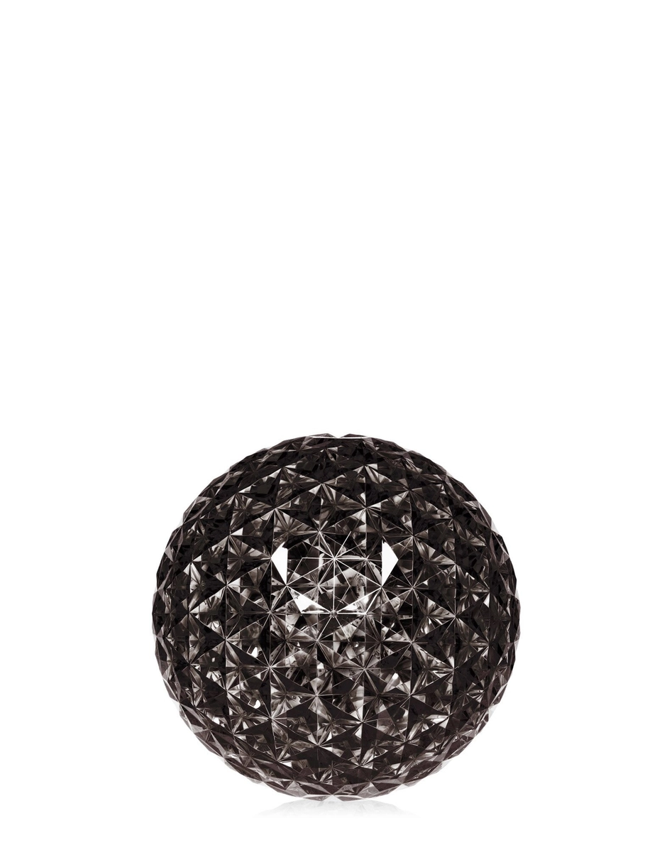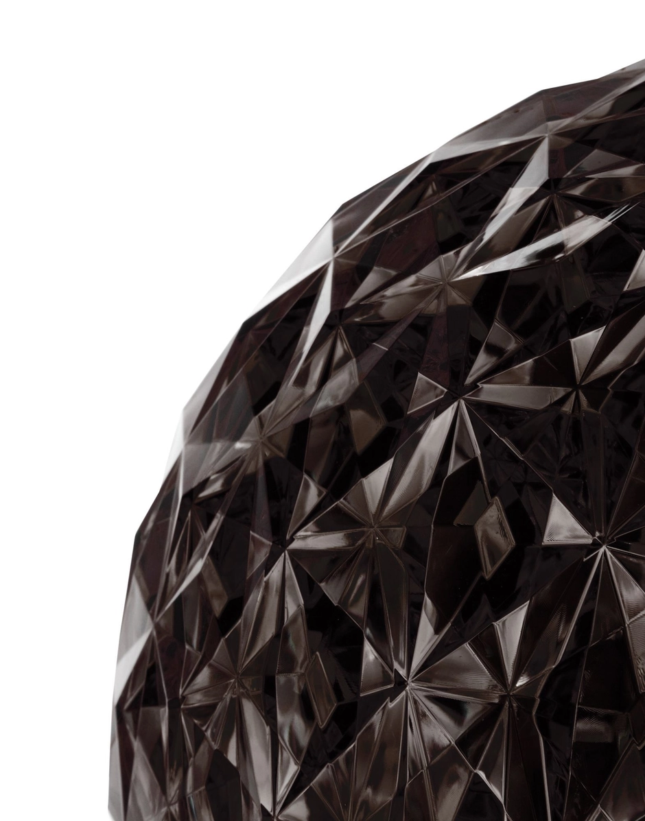 Une famille complète de lampes : à suspension, de table basse et avec structure en métal, et la dernière version, sur pied, disponible en deux hauteurs, de 130 et 160 cm. Leur particularité réside dans la forme légèrement ovoïdale du diffuseur transparent, caractérisé par une surface à facettes à l’intérieur comme à l’extérieur, qui crée un jeu intense de reflets.