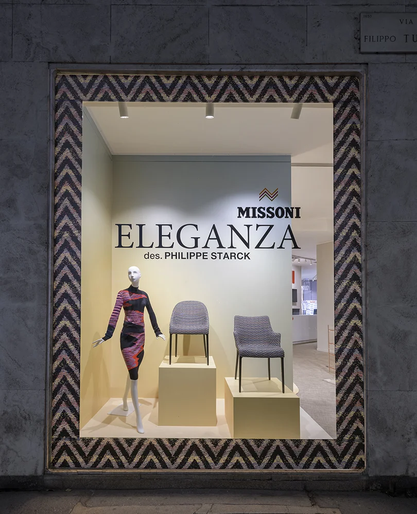 Protagonista è la seduta Eleganza ispirata alla moda per la sua linea sottile e delicata, uscita dalla creatività di Philippe Starck, che nella sua nuova edizione si presenta con un abito da passerella. Effetto zig zag come da tradizione Missoni per un tessuto su base scura con fili colorati che creano una geometria dal carattere forte molto in linea con lo stile Kartell. Gioco di reverse del tessuto, che nella sua trama consente l’utilizzo da entrambi i lati con effetti davvero sorprendenti.