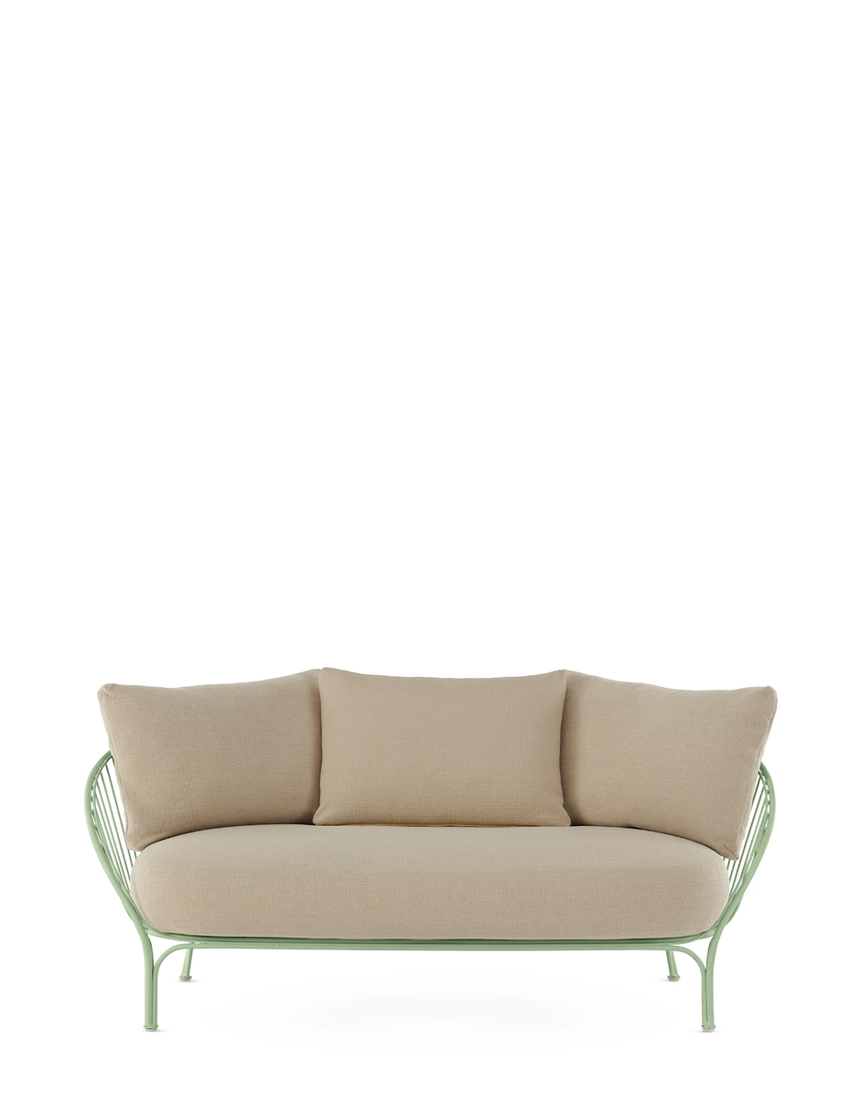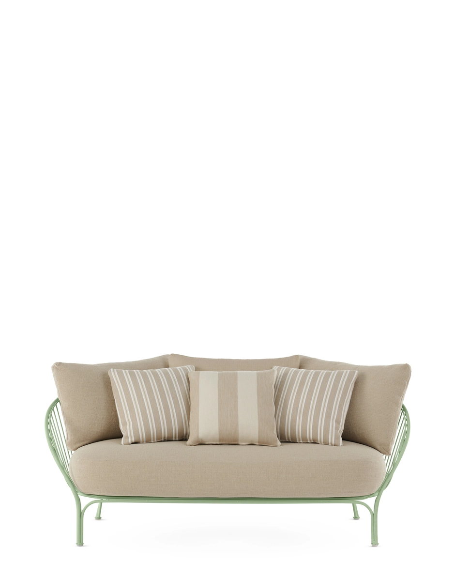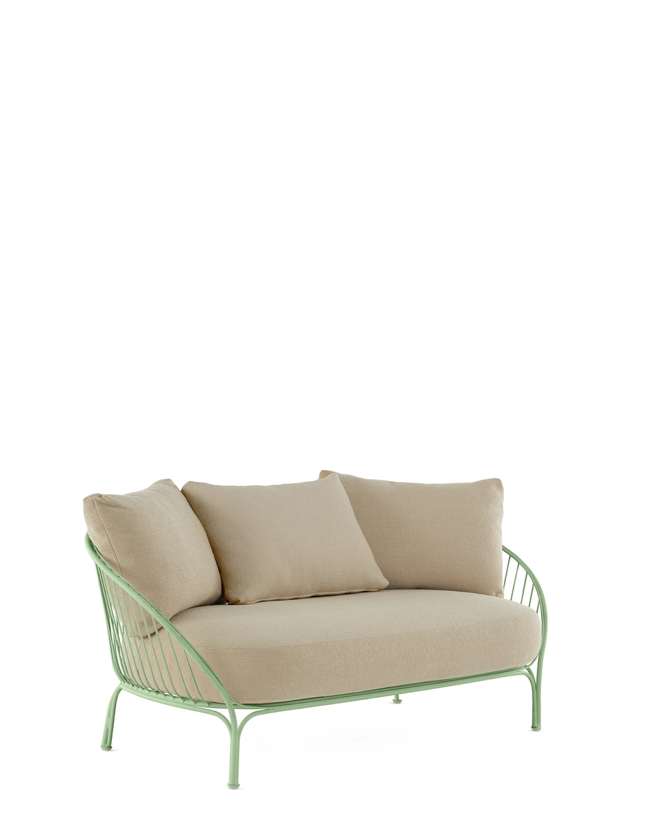 The HiRay family by Ludovica Serafini + Roberto Palomba expands with a new project: a sofa with more generous proportions, complemented by thicker cushions that enhance the seating experience, making it even softer and more comfortable. The new version of the sofa is designed to offer a more lounge-like and cosy experience, meticulously crafted to ensure optimal comfort, suitable for both residential and contract settings. The textile research further enhances the product, making it extremely versatile and suitable for outdoor use. The sofa is available in white, black, rust, and green. The complete collection includes a loveseat, armchair, side table, chair, bistro table, high table, and stool.