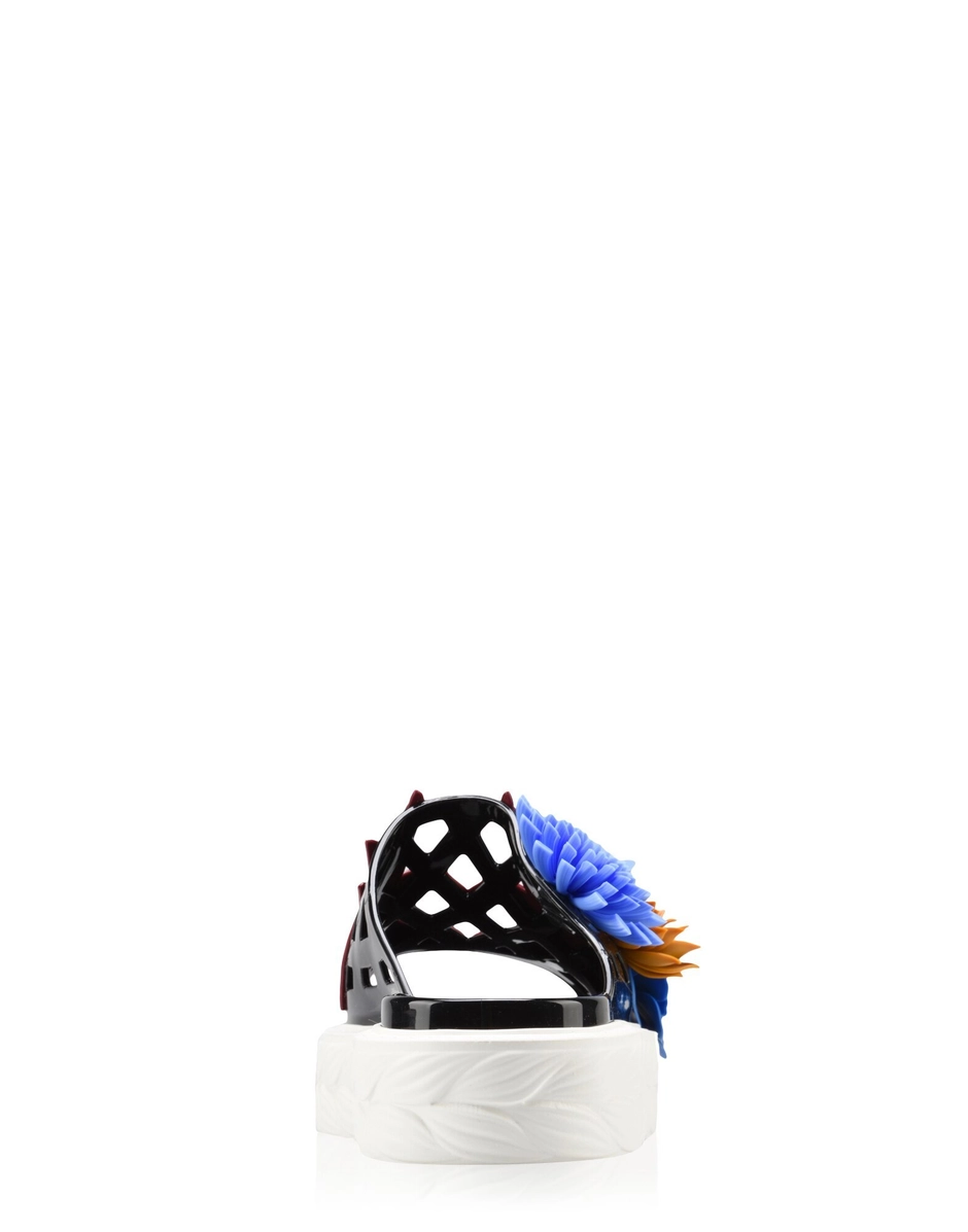 The Claudia sandal comes in different colour variants. The motif consisting of two hands joined in a heart shape characterizes the upper band, to which three-dimensional artificial flowers have been affixed.