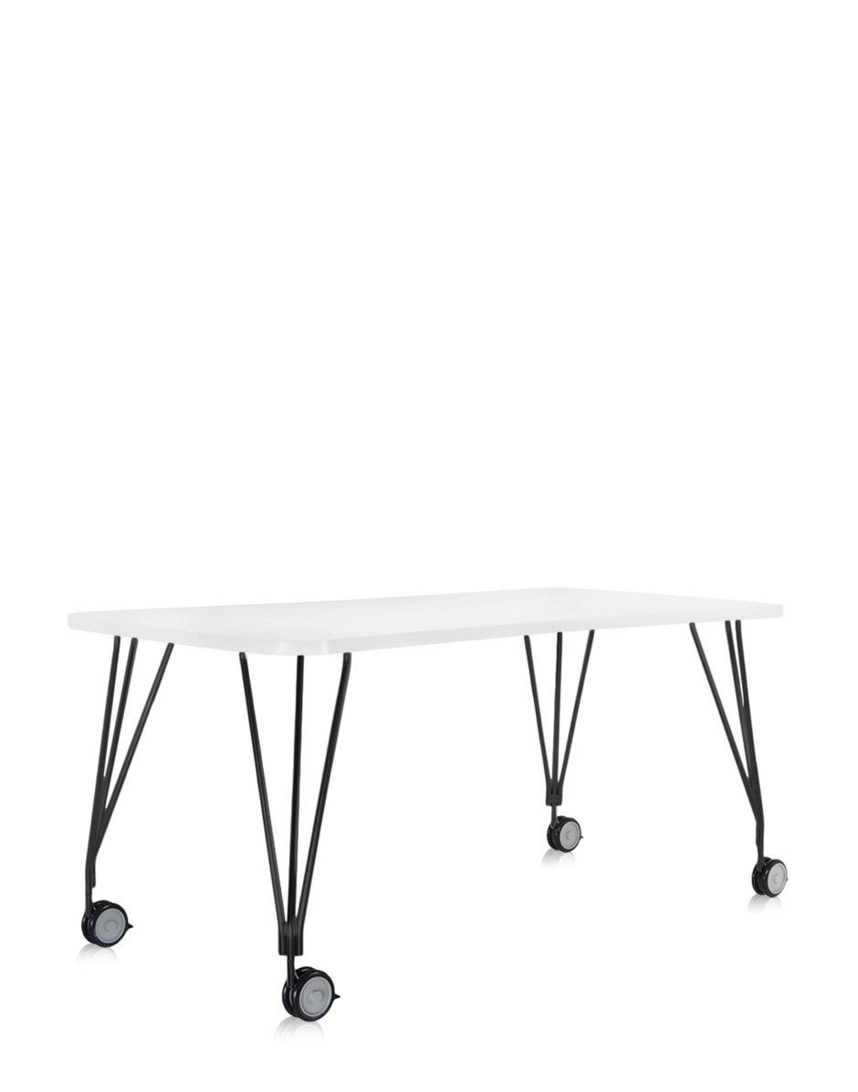 This study table was born for the office. The gentle, hourglass shape allows Max to sit side-by-side with tables of the same type as well as with other office furnishings. It can stand alone as a single workstation or together with companion pieces, creating work islands for open office spaces. The match-up combinations are easy and quick, thanks to its lightness and mobility, as demonstrated by the leg structures. Three metal tubes in chromed steel join at the base to form castors or feet. The castors are also equipped with auto-lock brakes for stability.