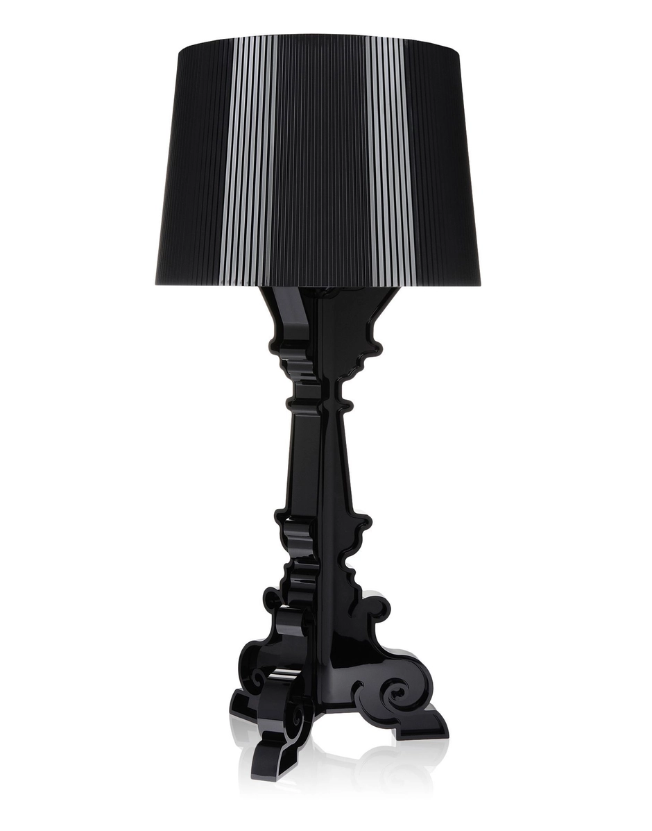 Bourgie unites classicism, wealth and tradition with technological innovation. The baroque-style base consists of three decorated elements that interlock, while the large shade is created with a pleated effect which creates a multitude of reflections when lit. Thanks to a special system used to hang the shade, three different heights can be obtained, altering them to suit personal preference, depending on the use to be made of the lamp: 68, 73 and 78 centimetres.
