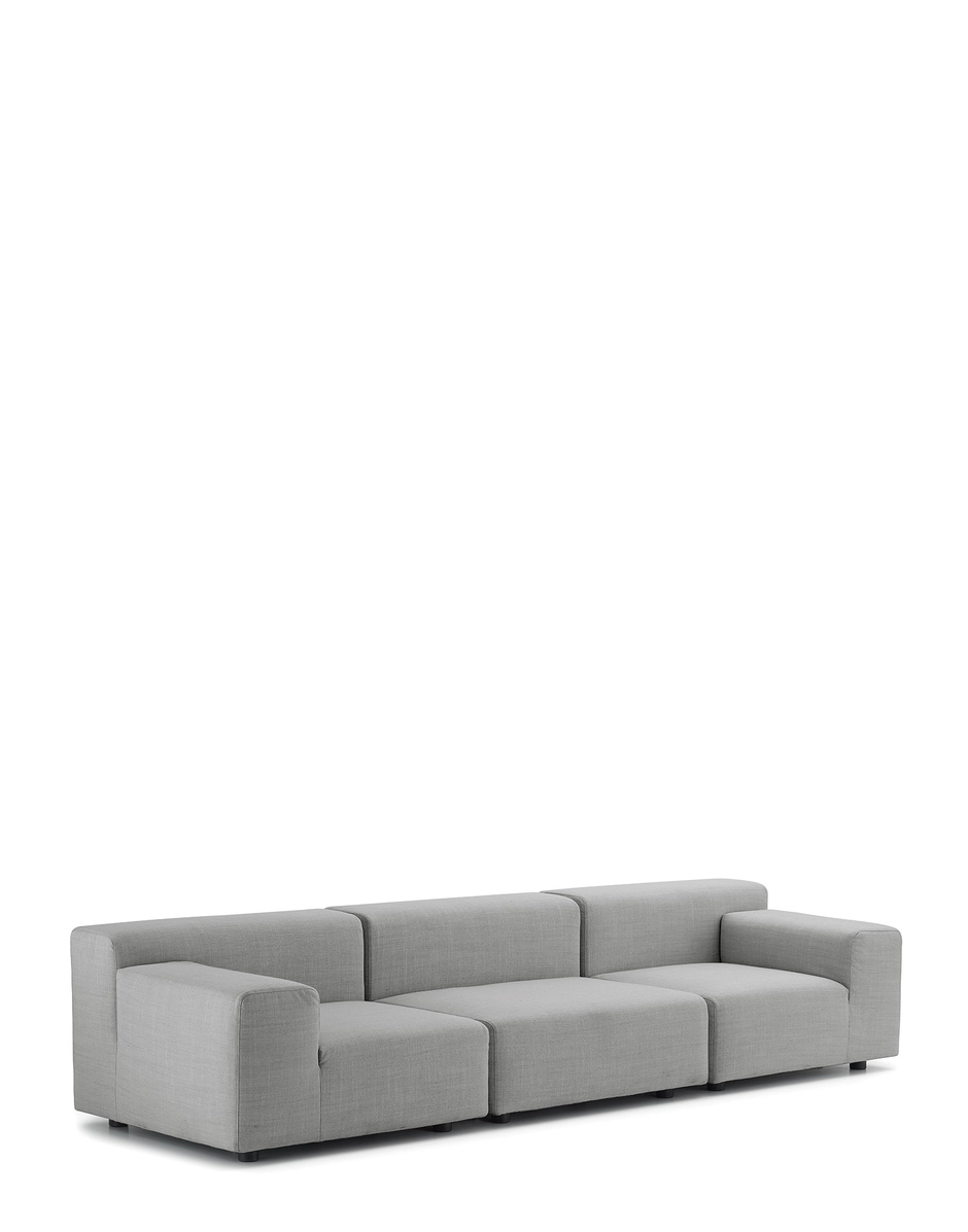 Plastic Outdoor is the outdoor version of the modular sofa with severe lines characterised by large cushions made of soft polyurethane upholstered in fabric. The Plastics collection is completed by an armchair with the same features and by a pouf, which can be used individually or as part of an arrangement.