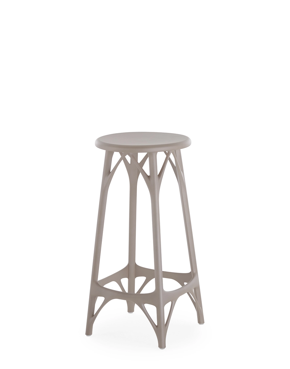 A stool made from recycled material for maximum sustainability. A.I. STOOL LIGHT is sustainable in materials and production process and is the result of thorough optimisation: three models can be made from the same mould, meaning that even industrial manufacturing can adopt a green approach. The added value of A.I. lies in the fact that it is the first product family conceived by Artificial Intelligence in response to input received from the designer (Philippe Starck) and the know-how of the company (Kartell). Specifically, creative thinking, company know-how and artificial intelligence have merged to develop a chair model based on an algorithm that respects the original brief of the designer and the company a comfortable product with the structural strength and solidity required while upholding one of Kartell’s main values: to be an injection-moulded industrial product of outstanding aesthetic quality.