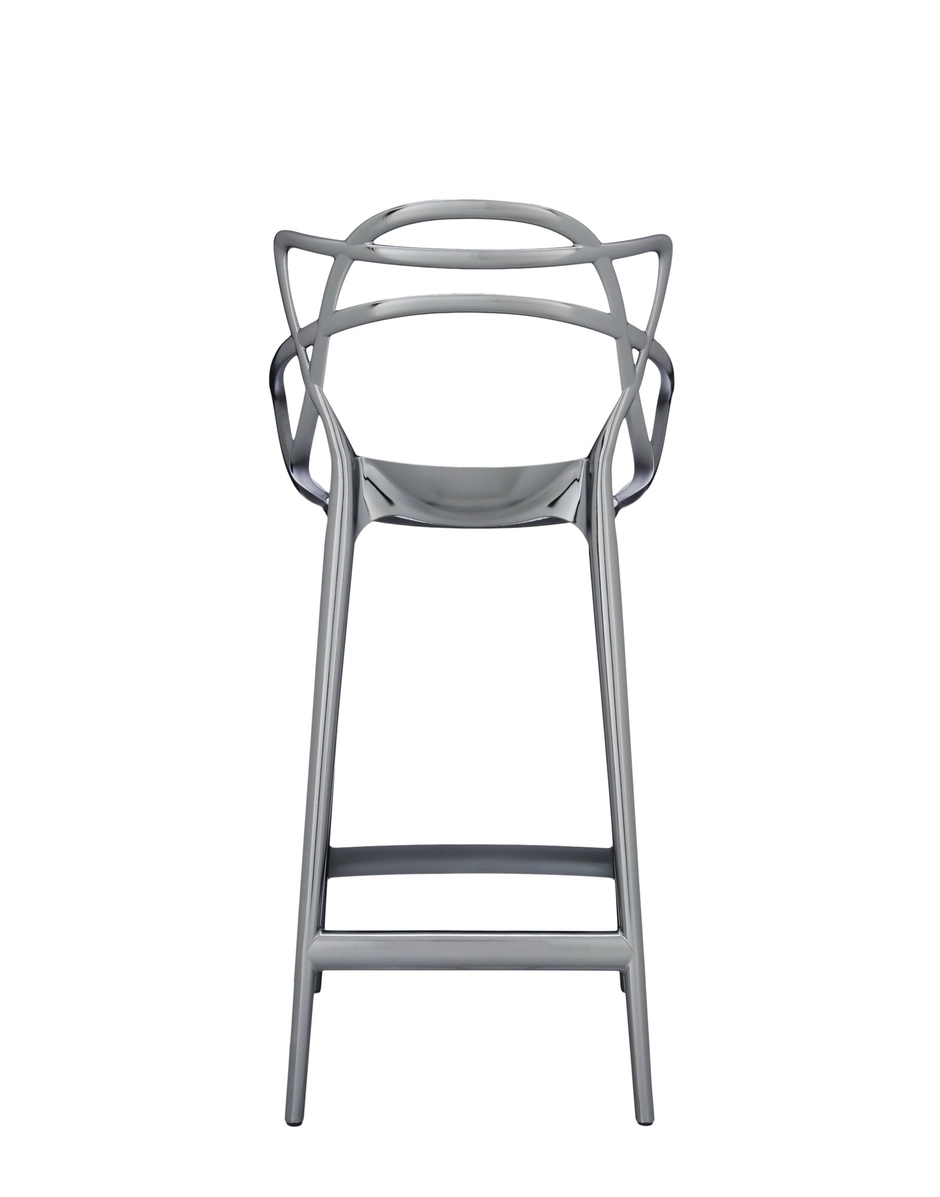 In the stool version of the Masters chair, the legs lengthen and the seat becomes more compact, but the unmistakable graphic style of the structure, created by interweaving the silhouettes of three iconic chairs, remains the same. Ideal for both domestic and contract use, the Masters Stool also lives perfectly outdoors.