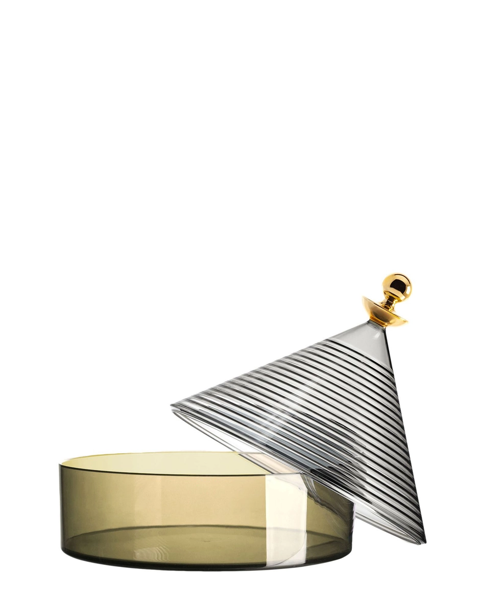 Trullo är en bordsförvaring med koniskt lock som är inspirerad av arkitekturen på husen i den italienska staden Alberobello. Fabio Novembre fortsätter sin kreativa väg influerad av arkitekturen i sin hembygd, den syditalienska regionen Apulien.