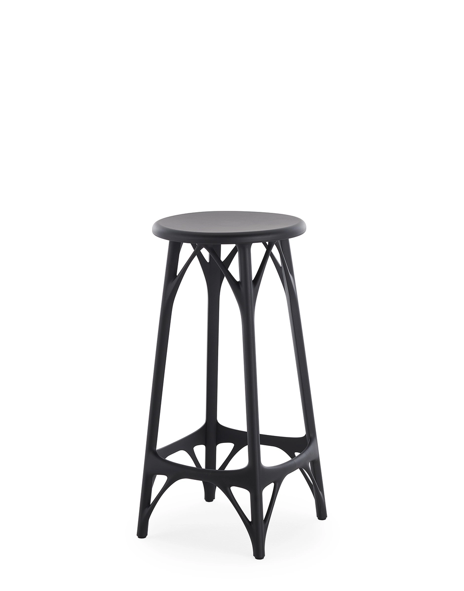 A stool made from recycled material for maximum sustainability. A.I. STOOL LIGHT is sustainable in materials and production process and is the result of thorough optimisation: three models can be made from the same mould, meaning that even industrial manufacturing can adopt a green approach. The added value of A.I. lies in the fact that it is the first product family conceived by Artificial Intelligence in response to input received from the designer (Philippe Starck) and the know-how of the company (Kartell). Specifically, creative thinking, company know-how and artificial intelligence have merged to develop a chair model based on an algorithm that respects the original brief of the designer and the company a comfortable product with the structural strength and solidity required while upholding one of Kartell’s main values: to be an injection-moulded industrial product of outstanding aesthetic quality.