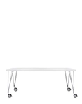 This study table was born for the office. The gentle, hourglass shape allows Max to sit side-by-side with tables of the same type as well as with other office furnishings. It can stand alone as a single workstation or together with companion pieces, creating work islands for open office spaces. The match-up combinations are easy and quick, thanks to its lightness and mobility, as demonstrated by the leg structures. Three metal tubes in chromed steel join at the base to form castors or feet. The castors are also equipped with auto-lock brakes for stability.