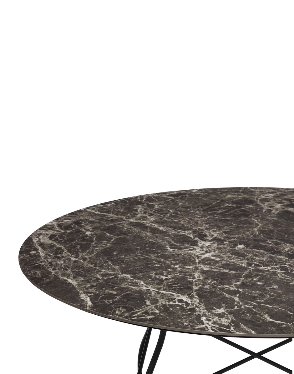 A family of tables ideal for the home and office. The light steel structure is made particular by the use of the cross element that joins the legs on each of the four sides, supporting the top. The collection comprises square, oval and round versions.